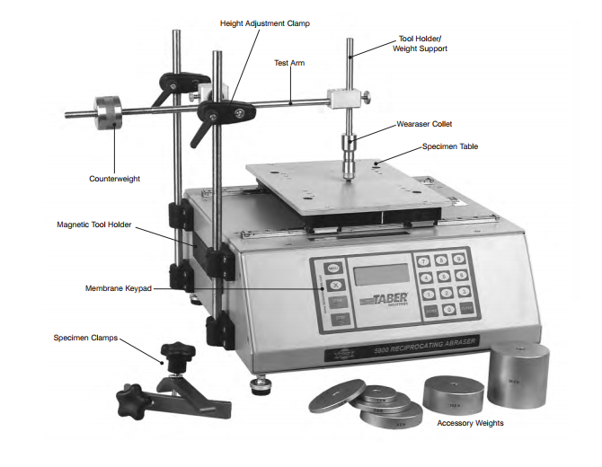 TABER®往復摩耗試験機は、ツールホルダー先端に装着した研摩スティックなどに対し、標本を載せたプラットフォームが水平に往復運動をする事で摩耗試験を行う事ができます。各種アタッチメントが用意されており、すり減らしたり、ひっかいたり、抉ったり、削ったり、こすったりする際の様々なダメージを測定できます。
