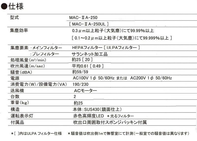| 商品名 | EC-MAC-250AC(ULPAフィルタ/200Vac) |